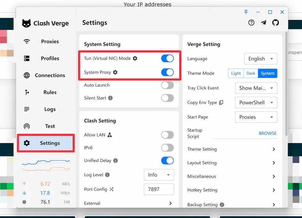 → Режим туннеля и Системный прокси (TUN Mode, System Proxy)